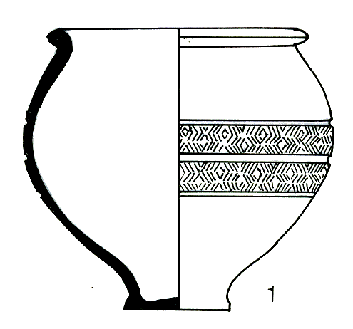 inclusions fines: quartz ; surface lissée. Trois sillons limitent deux zones ornées à la molette sur le milieu de la panse.