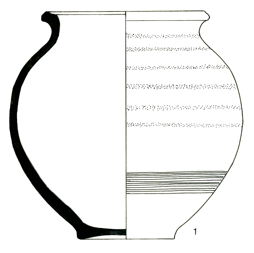 surface brute. Six lignes polies réparties du milieu de la panse jusqu'au milieu du col et zone horizontale