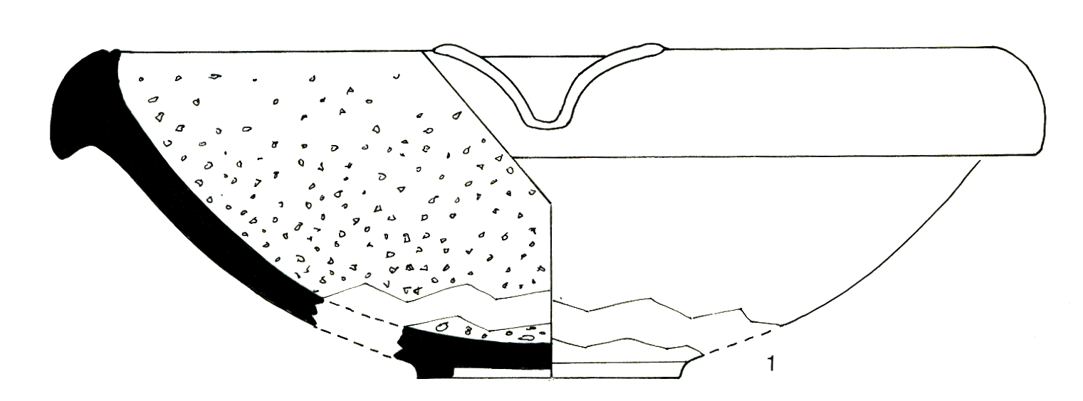 Mortier de forme hémisphérique ; rebord triangulaire, lèvre convexe ; base annulaire ; déversoir ; céramique tournée, couleur orangée en surface et sur les cassures ; inclusions fines: quartz en proportion moyenne, traces de mica ; surface engobée.