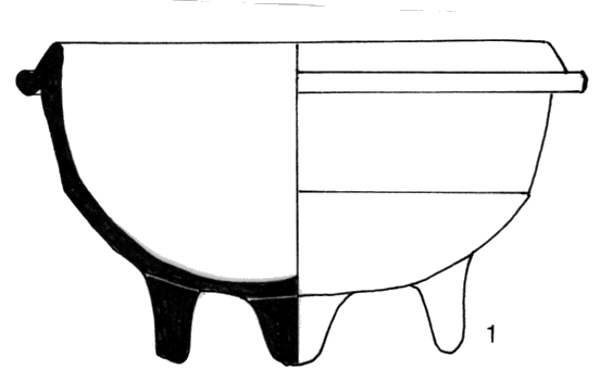 Partie supérieure d'une marmite tripode de forme hémisphérique ; rebord en méplat débordant, lèvre plate ;