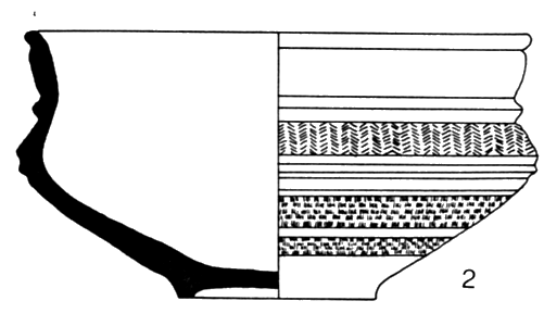 Jatte carénée aux parois divergentes rectilignes en bas, puis convergentes rectilignes ; encolure évasée, rectiligne, rebord aminci, lèvre ronde ; base annulaire, assise concave ; céramique tournée, couleur noire en surface et sur les cassures ; inclusions très fines ; surface polie. Impressions à la molette sur la panse.